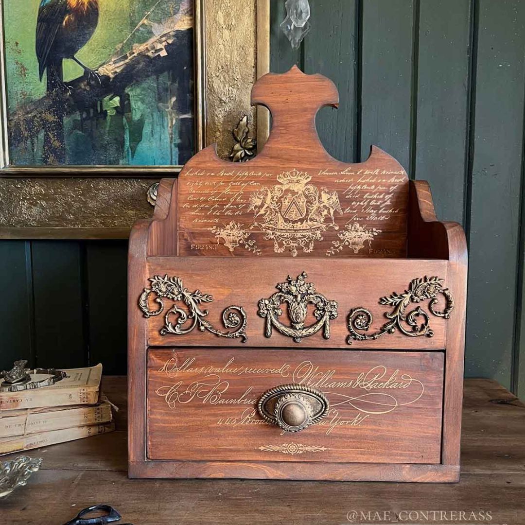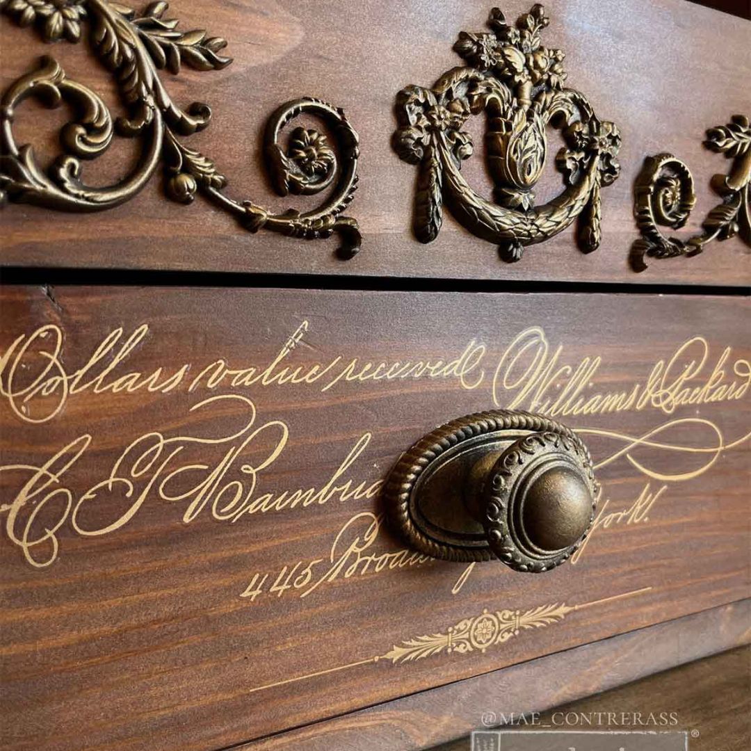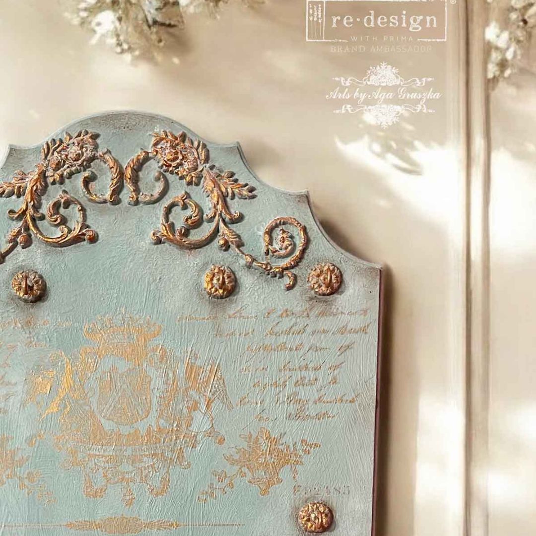 A Maxi Décor Transfer® – Queen’s Glory transzferfóliának a csodás arany díszítések és az antik hatású szövegek királyi jelleget kölcsönöznek. A történelmi kéziratok és elegáns jelvények által inspirált dizájn kifinomultságot és vintage hangulatot kölcsönöz bútoroknak, dekorációs daraboknak és művészeti projekteknek. A finoman részletezett szövegek és motívumok feldobják a festett felületeket, kifinomult, korhű megjelenést kölcsönöznek. A két darab 30.5 x 30.5 cm-es méretű lap sokoldalúságot kínál, lehetővé téve az elemek együttes vagy külön-külön történő használatát. A klasszikus arany tónusok gyönyörű kontrasztot alkotnak mind a sötét, mind a világos háttérrel, így minden egyes darab olyan, mint egy régi darab.