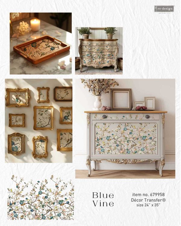 Finom szőlőindák kanyarodnak kecsesen ezen a bonyolult mintán, amelyet elefántcsontszínű virágok és élénk kék virágok díszítenek. A Blue Vine Décor Transfers® eleganciát és mozgást kölcsönöz minden felületnek, a sötét, drámai bútoroktól a világos, légies dekorációig. Sokoldalú és részletgazdag, tökéletesen illeszkedik mind a modern, mind a vintage stílushoz.